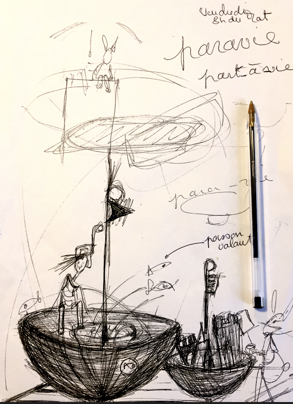 Les idées du matin-Dessins, gribouillages, mots tracés, crayonnés, collages. Il arrive quelque fois par magie de voir la naissance d’une sculpture ou d’une histoire à partager.